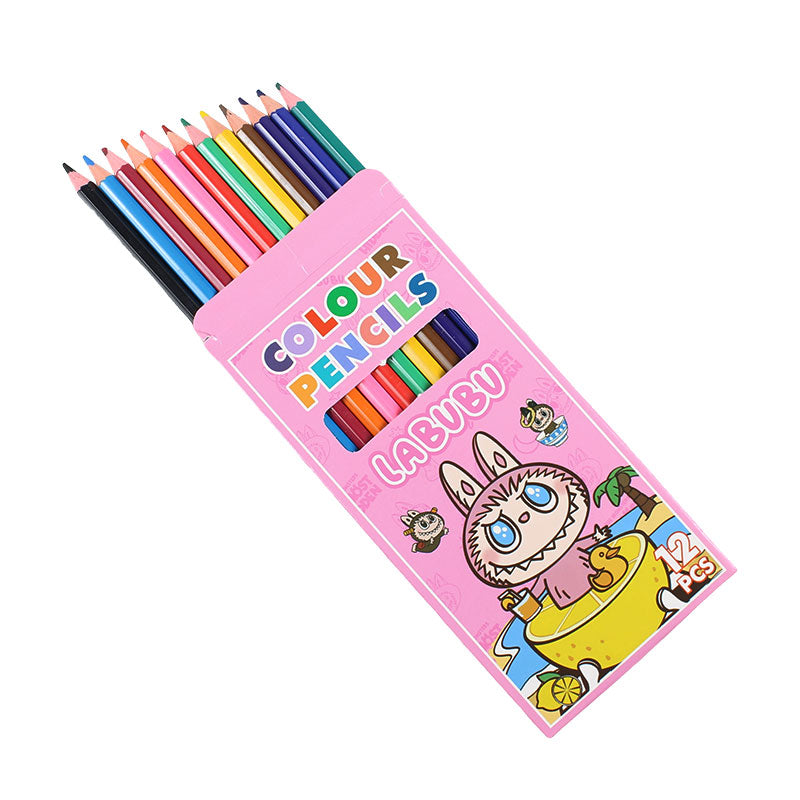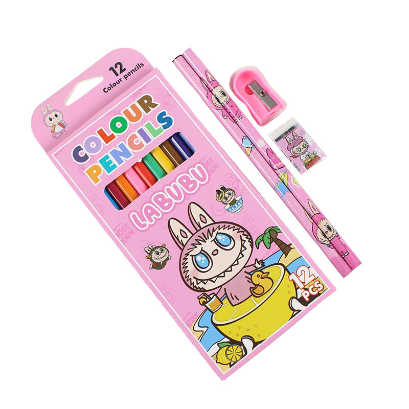 12 Colour Pencils, 2 Pencils, Eraser, Sharpener.