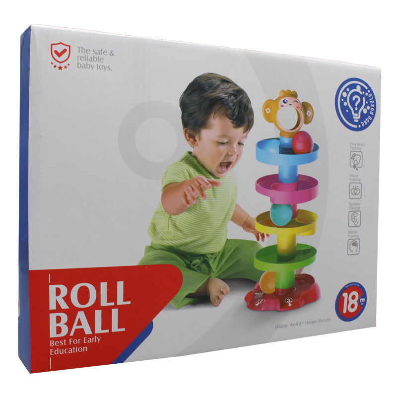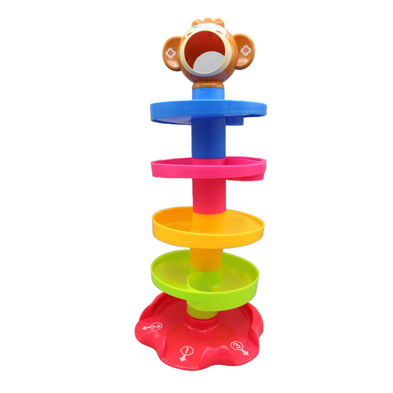Monkey Roll Ball Drop Toy for kids. This 5-tier product has a multi-colored ball ramp with three spinning balls containing colorful beads and shapes for even more interactive play. It is very simple to play simply placing the ball in the top hole and watch them fall and roll through each tier. Bright colors, sounds, and shapes enhance fine motor skills and problem-solving skills.Its package size is 29*11.5*23 cm